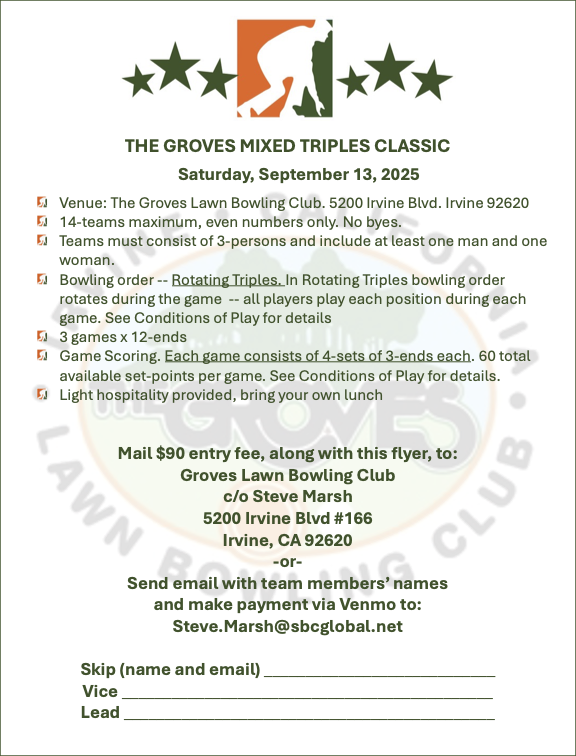 The Groves Mixed Triples Classic Saturday, September 13, 2025 8:55 AM 9:55 AM The Groves Lawn Bowling Club 5200 Irvine Boulevard Irvine, CA, 92620 United States (map) Google Calendar ICS CoP Entries