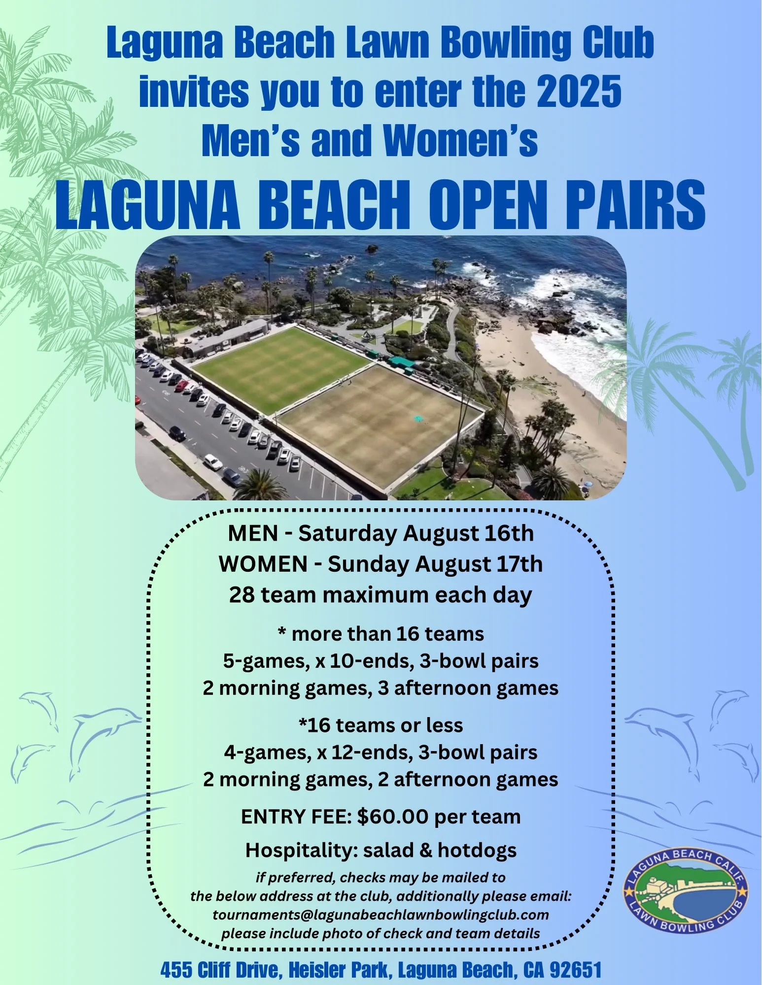2025 Laguna Beach Open Pairs Saturday, August 16, 2025 9:00 AM Sunday, August 17, 2025 6:00 PM Laguna Beach Lawn Bowling Club 455 Cliff Drive Laguna Beach, CA, 92651 United States (map) Google Calendar ICS Click on the Flyer below to enter the tournament Conditions of Play Entries