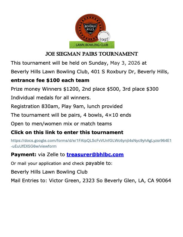 Back to All Events 2026 Joe Siegman Pairs Sunday, May 3, 2026 9:00 AM 5:00 PM Beverly Hills Lawn Bowling Club 401 South Roxbury Drive Beverly Hills, CA, 90212 United States (map) Google Calendar ICS 2026 Joe Siegman Pairs Entries Coming Soon