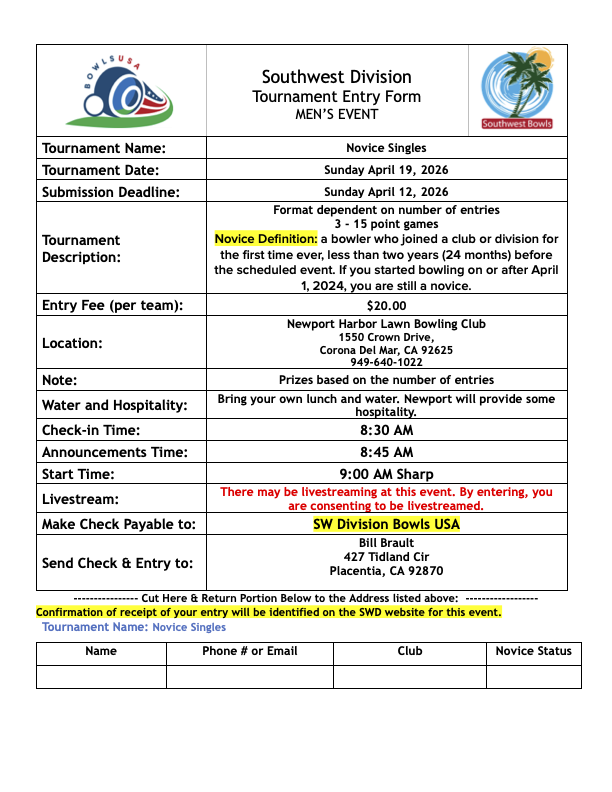 2026 SWD Men's Novice Singles Sunday, April 19, 2026 9:00 AM 5:00 PM Newport Harbor Lawn Bowling Club 1550 Crown California United States (map) Google Calendar ICS Flyer Conditions of Play Player Name